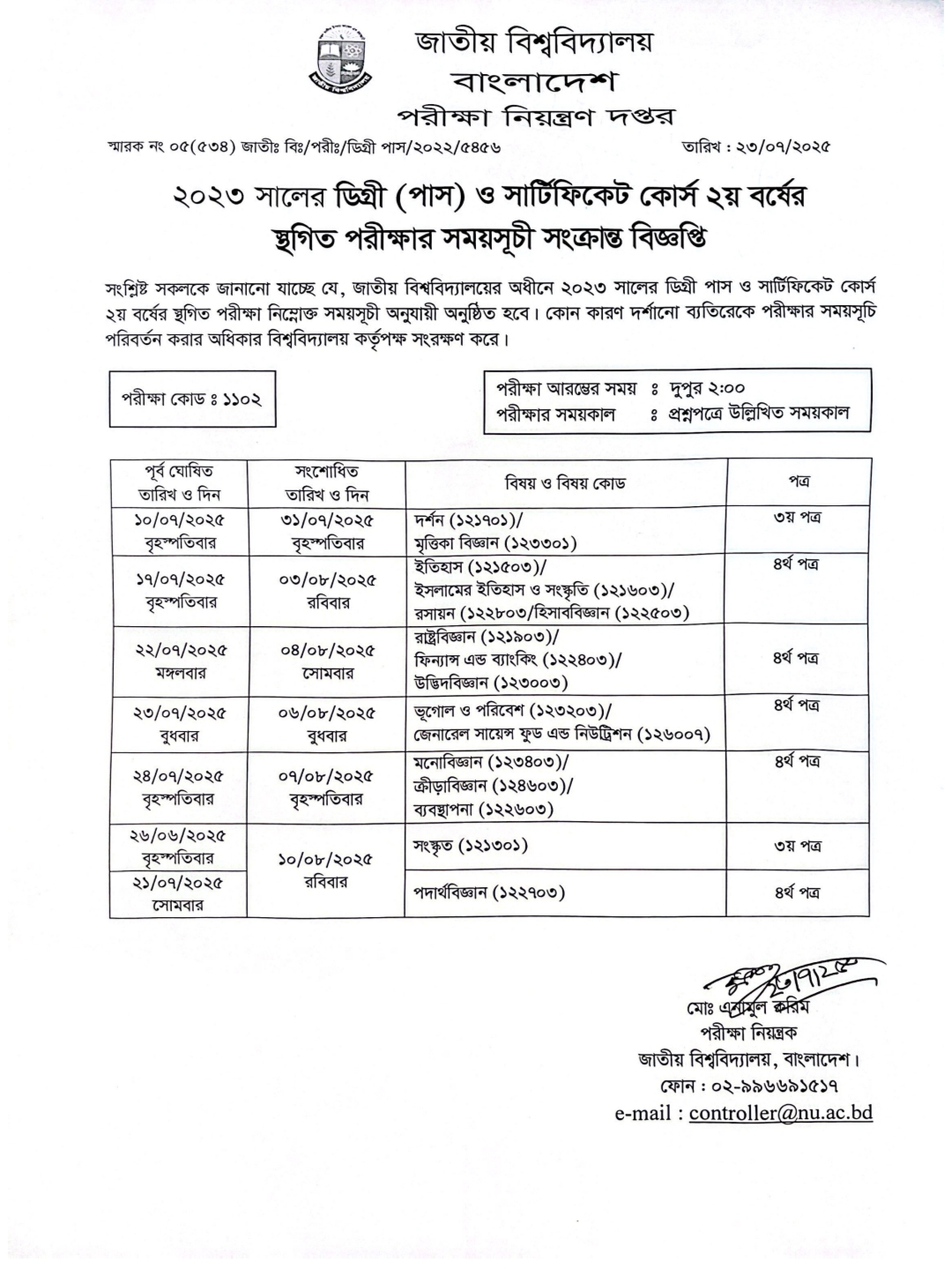 ২০২৩ সালের ডিগ্রী (পাস) ও সার্টিফিকেট কোর্স ২য় বর্ষের স্থগিত পরীক্ষার সময়সূচী সংক্রান্ত বিজ্ঞপ্তি