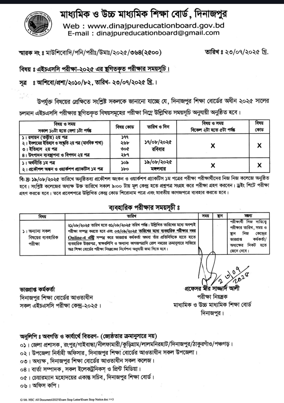 উপর্যুক্ত বিষয়ের প্রেক্ষিতে সংশ্লিষ্ট সকলকে জানানো যাচ্ছে যে, দিনাজপুর শিক্ষা বোর্ডের অধীন ২০২৫ সালের চলমান এইচএসসি পরীক্ষার স্থগিতকৃত বিষয়সমূহের পরীক্ষা নিম্নে উল্লিখিত সময়সূচি অনুযায়ী অনুষ্ঠিত হবে।