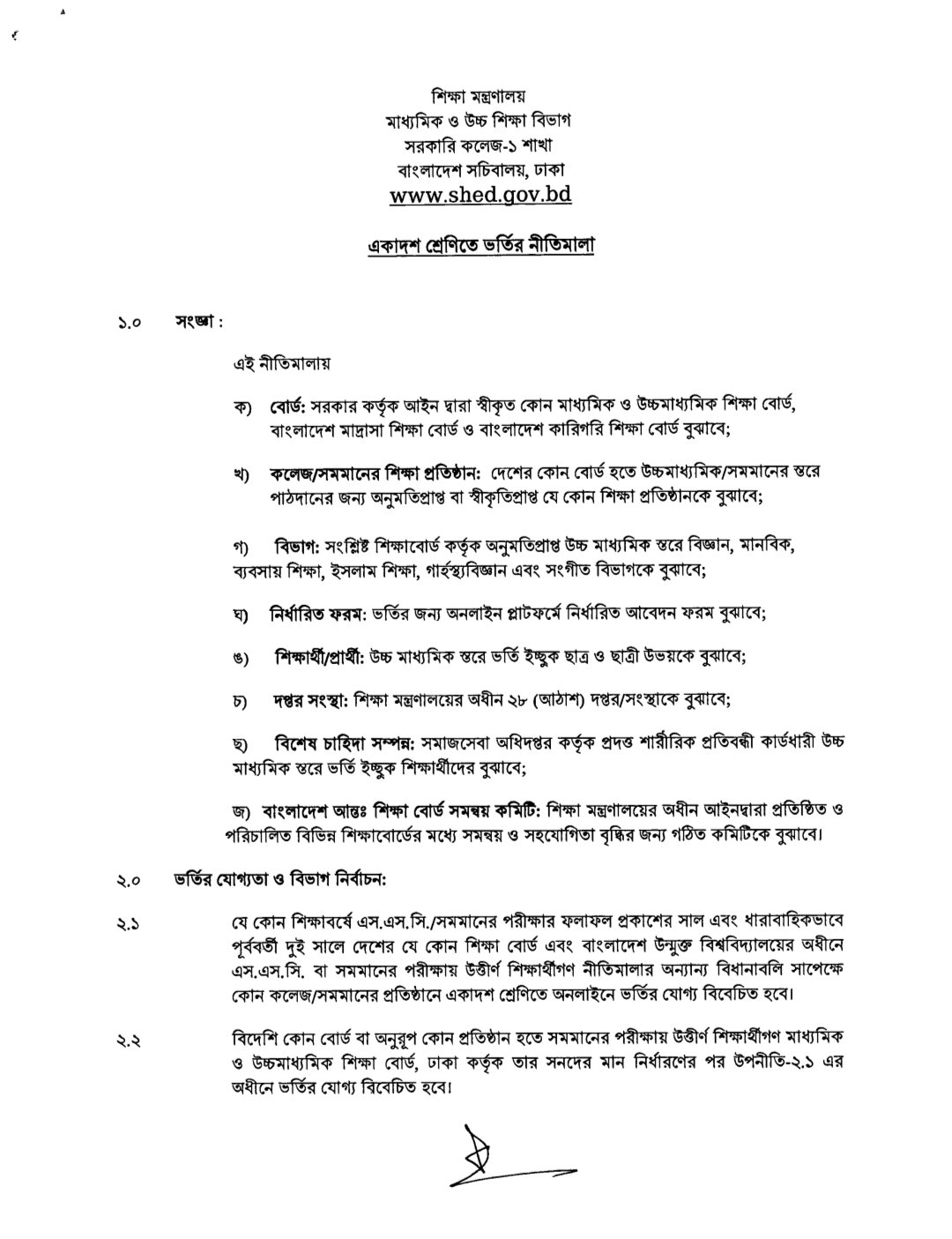 একাদশ শ্রেণিতে ভর্তির নীতিমালা - Page -1