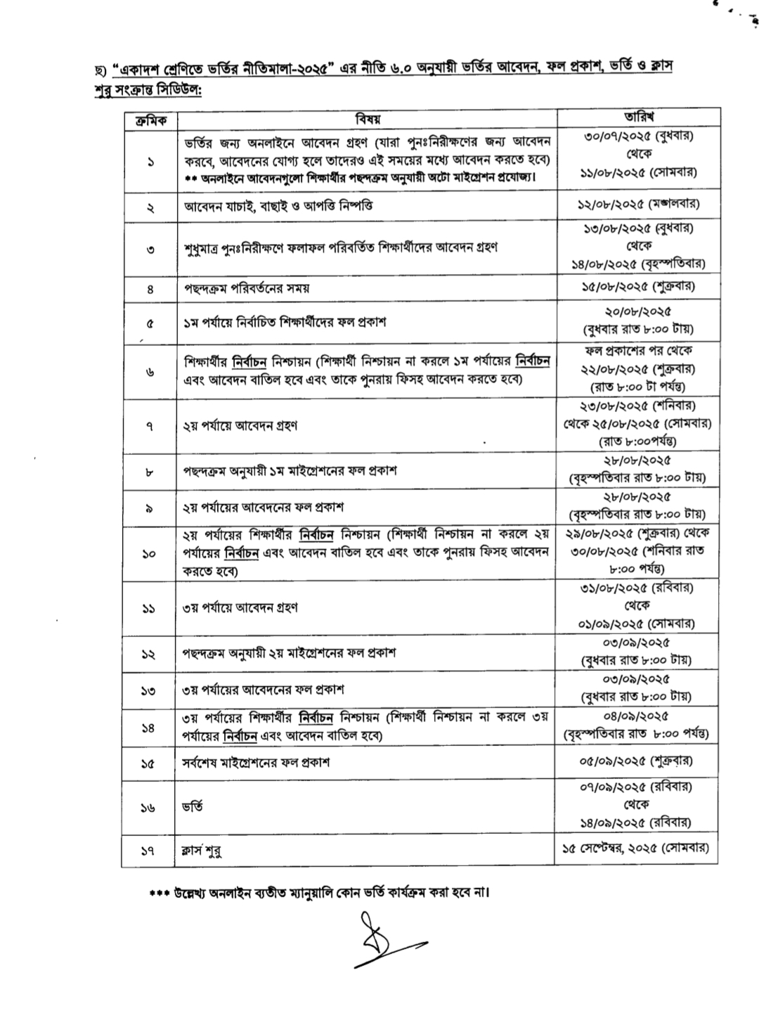 একাদশ শ্রেণিতে ভর্তির নীতিমালা - ২০২৫ খ্রিঃ