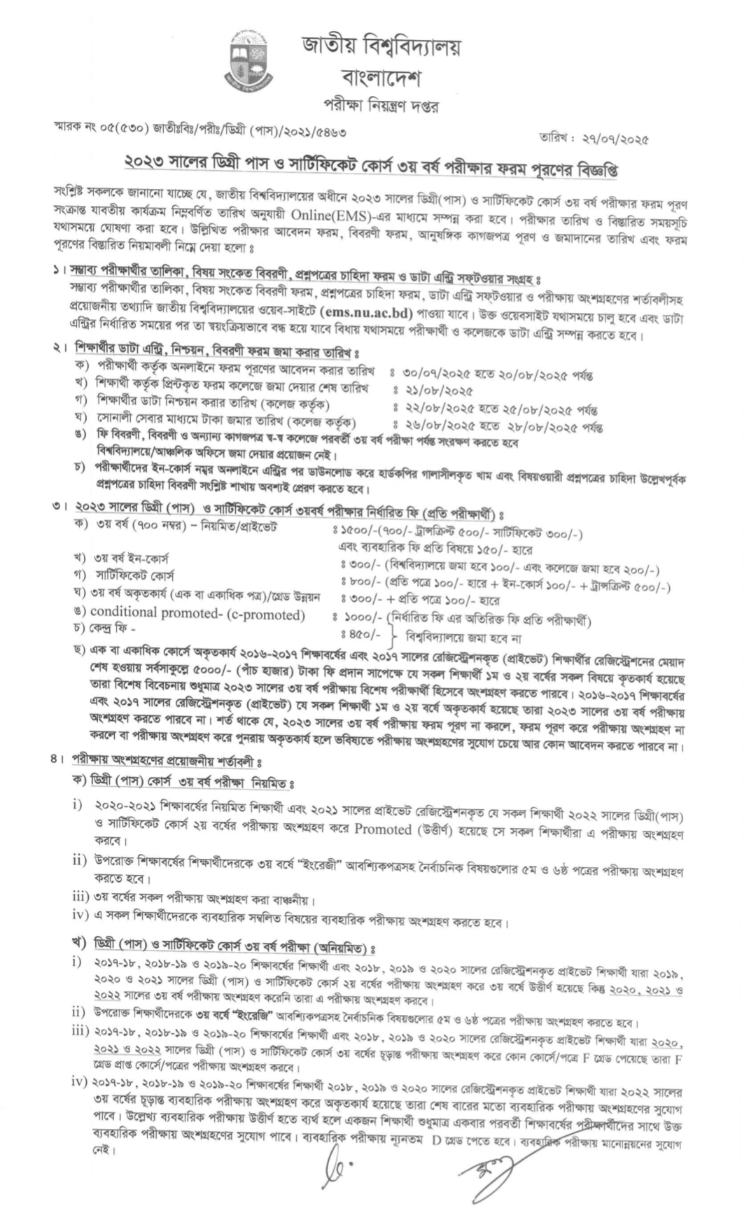 ২০২৩ সালের ডিগ্রী পাস ও সার্টিফিকেট কোর্স ৩য় বর্ষ পরীক্ষার ফরম পূরণের বিজ্ঞপ্তি