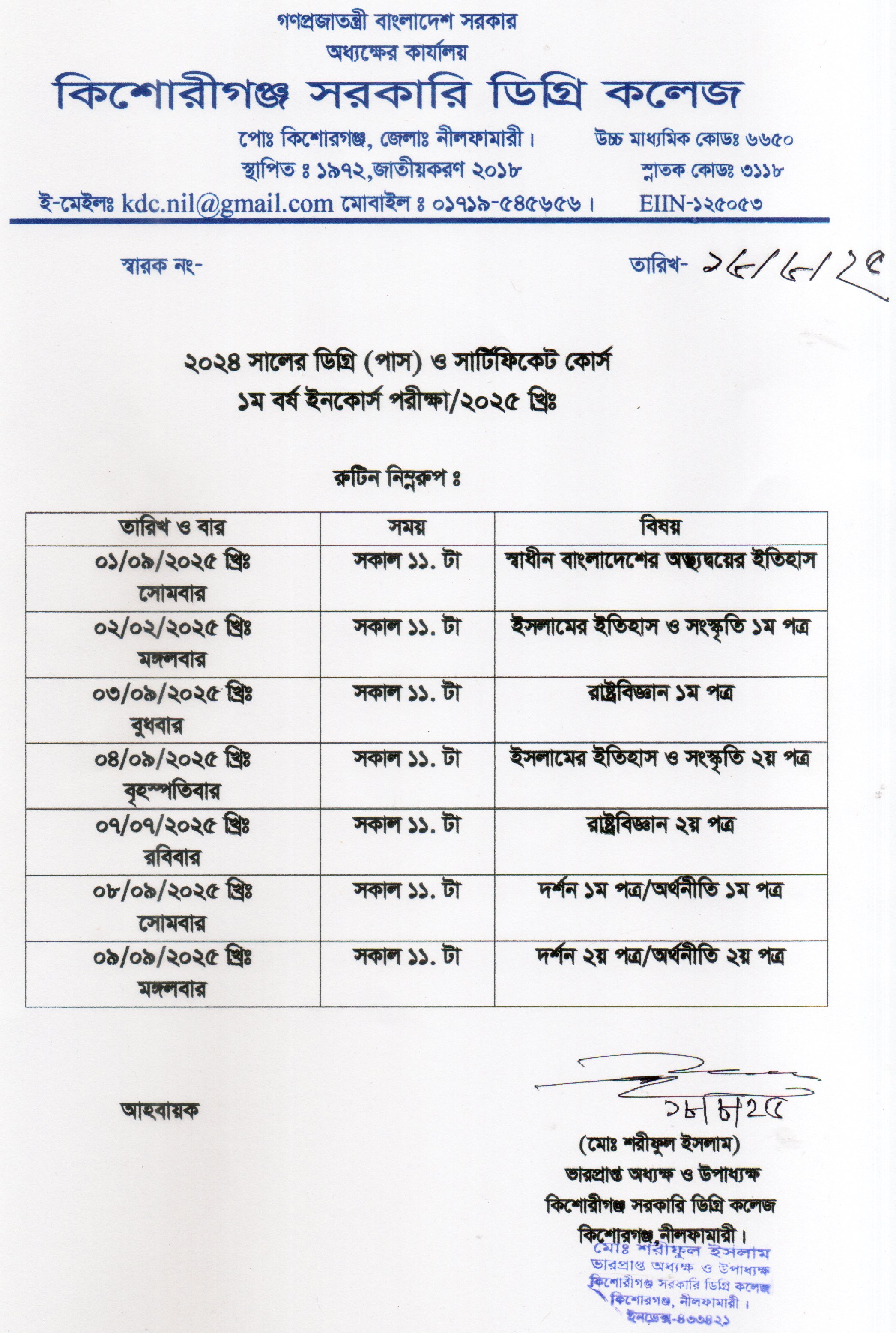 ১ম বর্ষ ইনকোর্স পরীক্ষা/২০২৫ খ্রিঃ